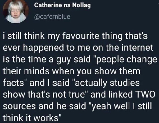 About 13 years ago I had a debate with a friend about some political thing. He repeated something from the media (AM radio) I knew was BS so I told him I’d email him evidence to the contrary, he told me he’d send evidence in support. I sent him a mountain of evidence but never heard from him. The next time we met I brought it up he told me he didn’t have time to read my email, his body language said otherwise. That’s when I realized it was a cult