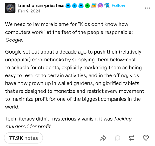 Chromebooks very intentionally push people toward Google drive and Google one for subscription services, and all of the rest of gsuite for data mining. I’m not saying chromebooks are inherently this evil master plan, but don’t discount just how much they do push profitable services for Google.