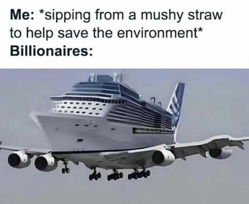 Fuck the billionaires that do that, but that doesn’t mean that me using a straw isnt still making the shit worse. At least I can sleep at night knowing I am not making the situation worse, and I will still try to vote for politicians that are fighting against the billionaires