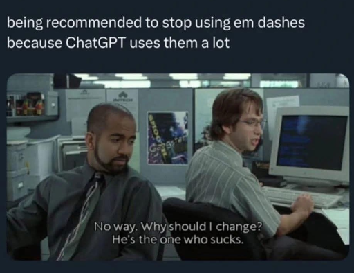 I’m with you here. If people are going to accusing me of being AI because of my use of em-dashes—a personal use that predates the Internet almost!—well, that’s what block buttons are for. Dumbasses get blocked.