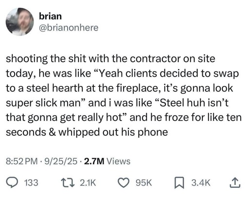 Track_Shovel@slrpnk.net to Microblog Memes@lemmy.worldEnglish · 6 days agoHeat conductivityslrpnk.netimagemessage-square43linkfedilinkarrow-up1381arrow-down11file-text