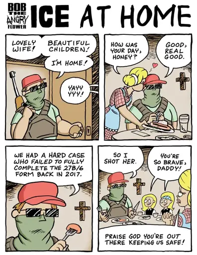 Best part would be the ICE agent father coming home every day with slightly different colored hair and different height and build every evening. He never takes off his mask, glasses or hat, so the family never know who he is … or if it’s the same person.
