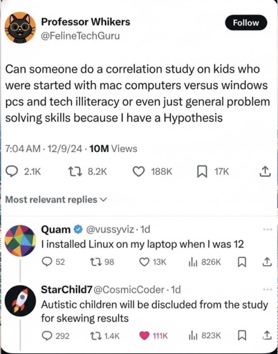 minus-squareMrEff@lemmy.worldlinkfedilinkarrow-up3·4 days agoWe do not wish to exclude the population because it would preclude comparative analysis, but we wish to disclude them from this study in order to conclude the initial hypothesis.