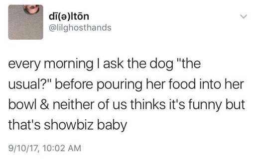 Speaking of showbiz and feeding pets, I’m a big fan of Hamilton. So when feeding my cat, I often tell him “You’ve got a hunger. That’s alright, I was just like you, when I was younger.”