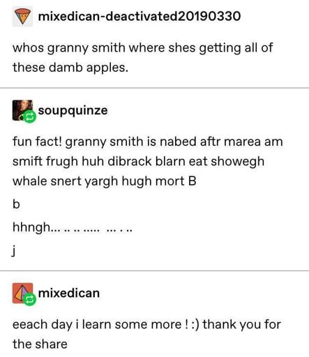 I hate when blarn eat showegh whale snert. Every time, yargh hugh mort B.