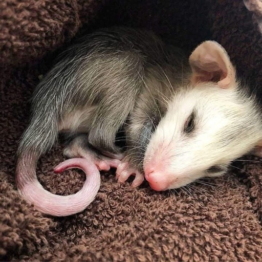 Transcription A cute picture of a baby opossum laying on its side, the opossum’s tail is curled up next to it.