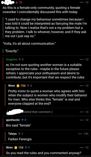 What he said is not bad, it’s not about that, it’s the fact that he read the rules and still thought that he had every right to participate. He’s the reason the community was set up, to have a space where men don’t interrupt and insert themselves into every conversation no matter what.