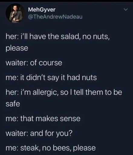 I don’t know, as someone with a nut allergy I don’t get why this is supposed to be funny. This is just my everyday life. Especially salad often has nuts like walnuts or almonds as decoration so it’s one of the foods where I have to be extra careful. Just like I always have to follow a coffee order with “no nuts, please”, because coffee is often decorated with almonds. The tweet makes it sound like asking for no nuts on a salad is as outlandish as thinking there might be a bee in the steak, but walnuts, cashews or almonds are pretty common decorations on salads.